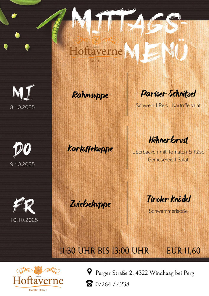 Von Mittwoch bis Freitag gibt es täglich ein warmes Mittagsmenü bei uns in der Hoftaverne.